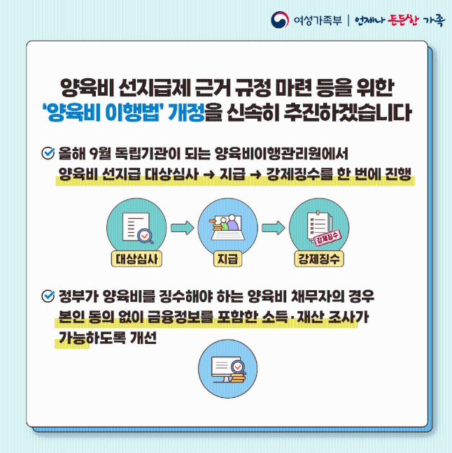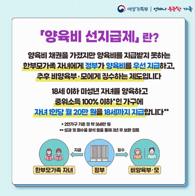 | 지급 주체 | 양육비 채무자(비양육부·모) | 국가가 선지급 후 회수 |